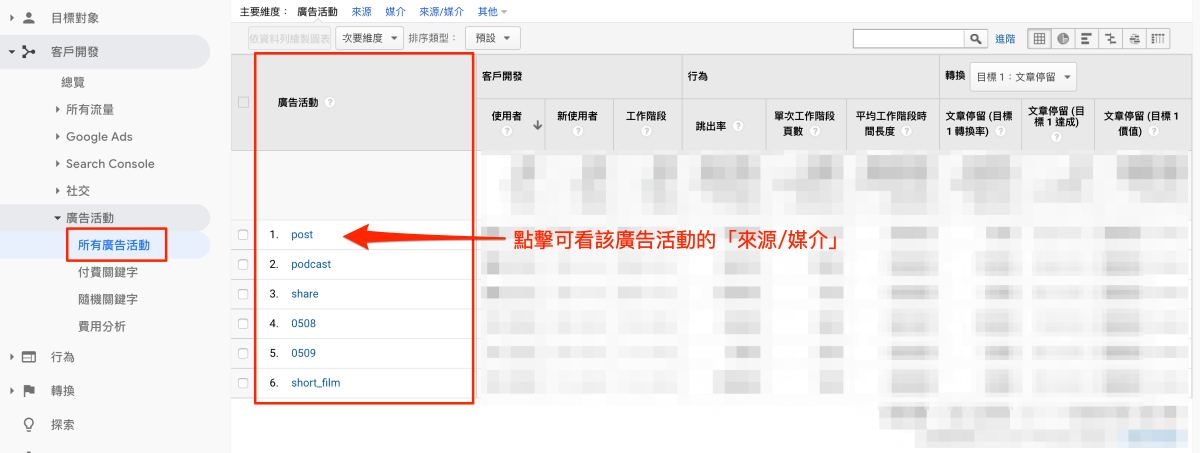 點擊任一個「廣告活動」後,就可以看到該廣告活動的「來源/媒介」數據表現