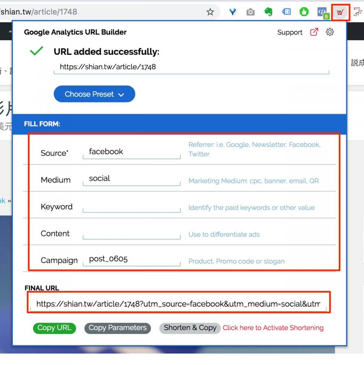 1. 到你的目的網頁上,點擊 Google Analytics URL Builder 開啟,Plugin 會自動帶入網址