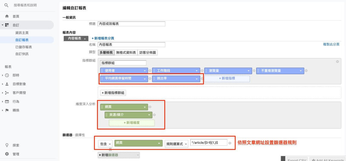 因此,我們想知道網站所有文章的成效數據,要在 GA 報表中呈現並觀察數據的話,我們可以使用 GA 自訂報表功能,只要就針對內容建立所需要的自訂報表,這也利於之後可持續觀察。