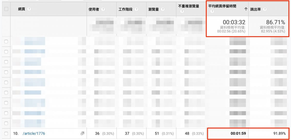 我們可以透過報表數據觀察到,目前整體文章內容頁的平均網頁停留時間為3分32秒,表示整體的文章內容平均停留時間是好的,但這只是平均的數據,我們要找的是低於平均的停留時間內容,找到它並進行優化處理。
