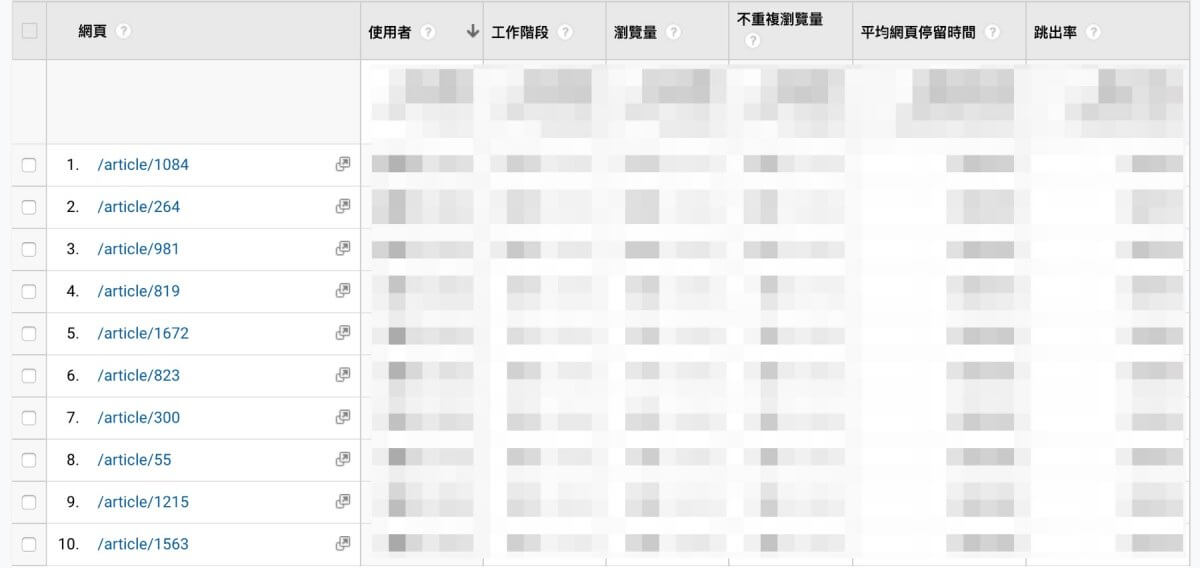 最後,我們完成了文章內容頁的數據報表了,可以透過這個自訂報表看到所有文章的指標數據,像是瀏覽量、工作階段、跳出率、平均網頁停留間…等指標,這些指標數據就可以讓我們進行文章成效評估。