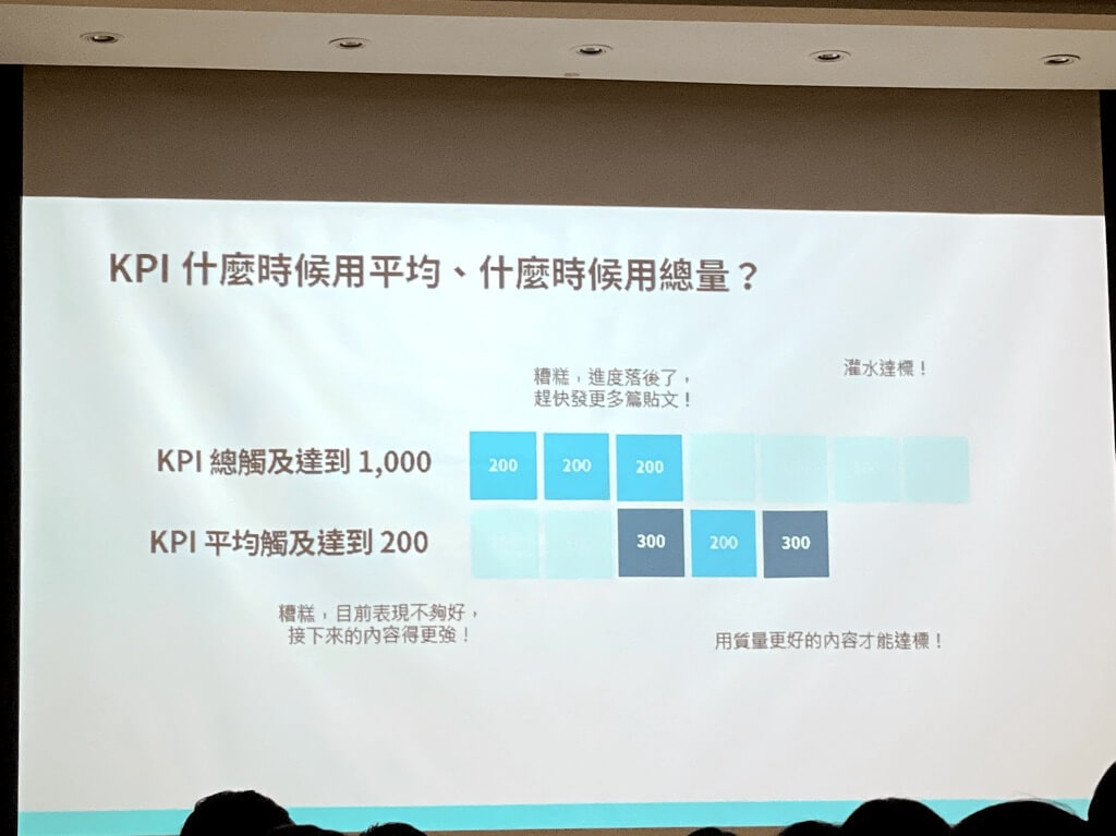傑哥說明如果用總觸及當作 KPI 的,無法有效的讓貼文數據真實反應出來,因為發現即將未達標時候,就再多發幾則貼文觸及即可,這樣對每一篇貼文成效無法正確掌握及評估。