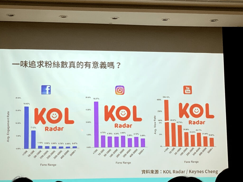 傑哥在這裏用 KOL Radar 圖表說明,當粉絲數越大時粉絲觸及越低,這是經營社群媒體需要思考的,越多假粉絲會讓粉絲團經營越辛苦,讓真實觸及到的粉絲數降低很多。