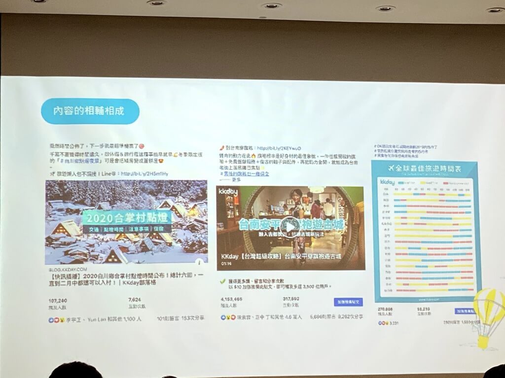接下來由 kKday 小編長分享如何透過內容經營社群,小編長分享「合掌村點燈」案例,掌握社群資訊嗅覺提供編輯撰寫內容,並在 Facebook 粉絲團貼文,果真達到很高的觸及、互動、按讚、分享,是一個透過社群資訊引導內容成功案例。
