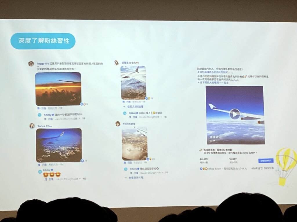 深度了解粉絲習性,小編長以坐出國旅遊坐飛機為例,大部分喜愛出國旅遊的人,手機上一定都會有一張飛機窗外的風景照片,因此 KKday 在Facebook 粉絲專頁上貼出照片後,讓大多數粉絲們有同感,並且粉絲們也在留言上一一貼出類似照片,產生小編與粉絲互動的有趣情景。