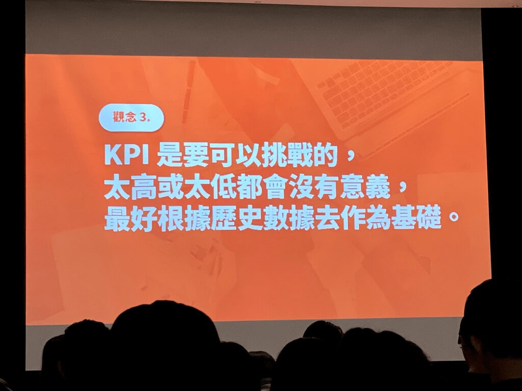 - 觀念3. KPI 是要可以挑戰的,太高或太低都會沒有意義,最好根據歷史數據去做基礎。