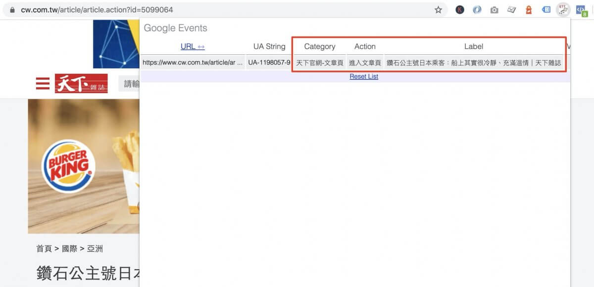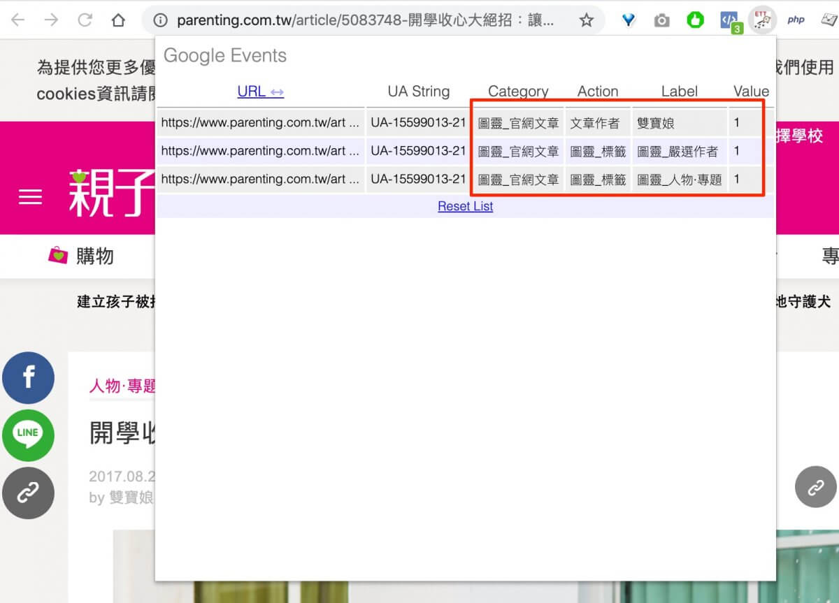 如上圖所示,因為要追蹤文章次數、文章分類、作者點擊數量,因此在網頁載入完後自動送出文章作者、分類的 GA 事件。