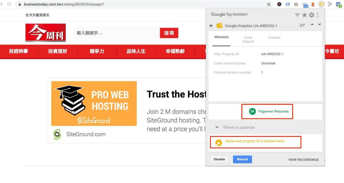 透過 Tag Assistant 工具檢查,可以看到該網站該頁同時間送出了多個 PagevViews 至同一個資源(property ID)。