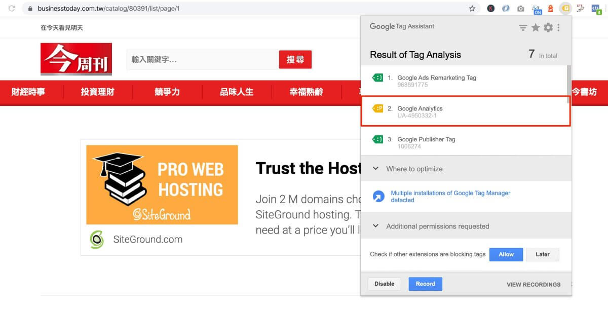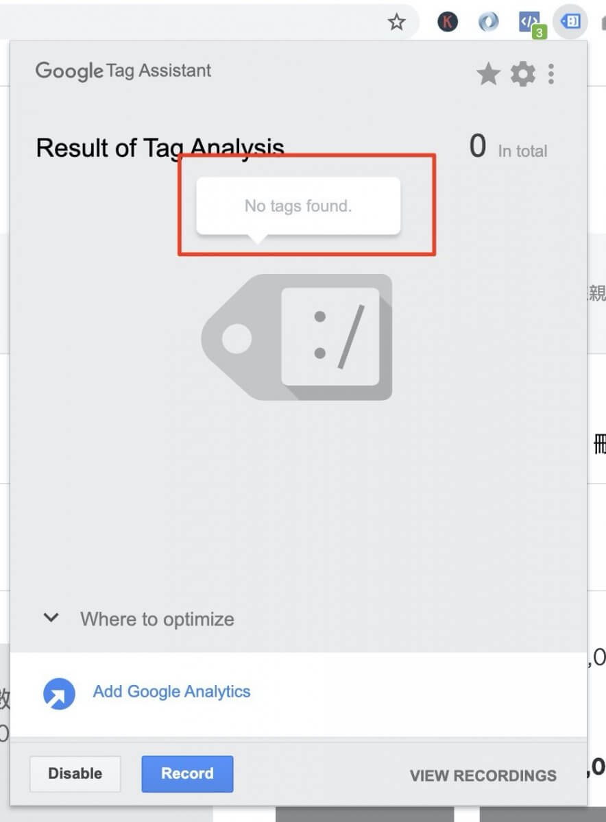 Tag Assistant 工具看出該網頁沒有埋設任何與 Google 相關的 Code,也包含了 Google Analytics Code。
