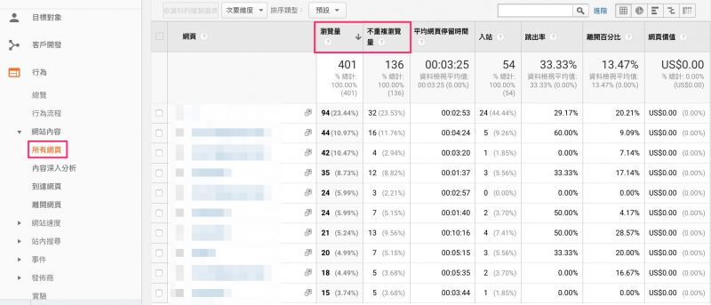 一般來說瀏覽量、不重複瀏覽量,可以從 行為報表 > 網站內容 > 所有網頁 進入查看,且預設排序就會是依照瀏覽量大到小排序,從中您就可以看到哪些頁面最受歡迎、最多人瀏覽,更可以看整體的瀏覽量表現,衡量您的網站目前有多少價值,以廣告語言就是PV。